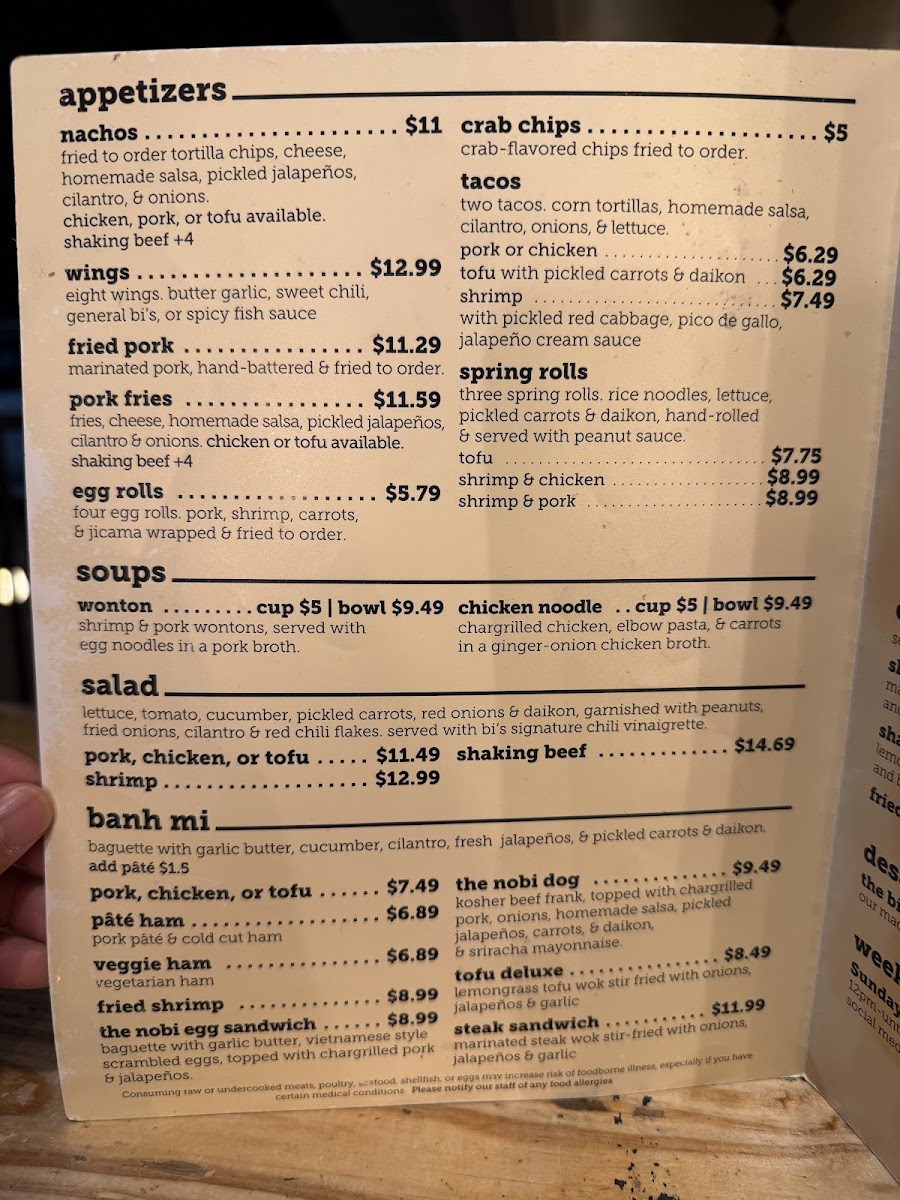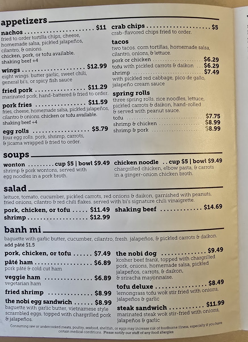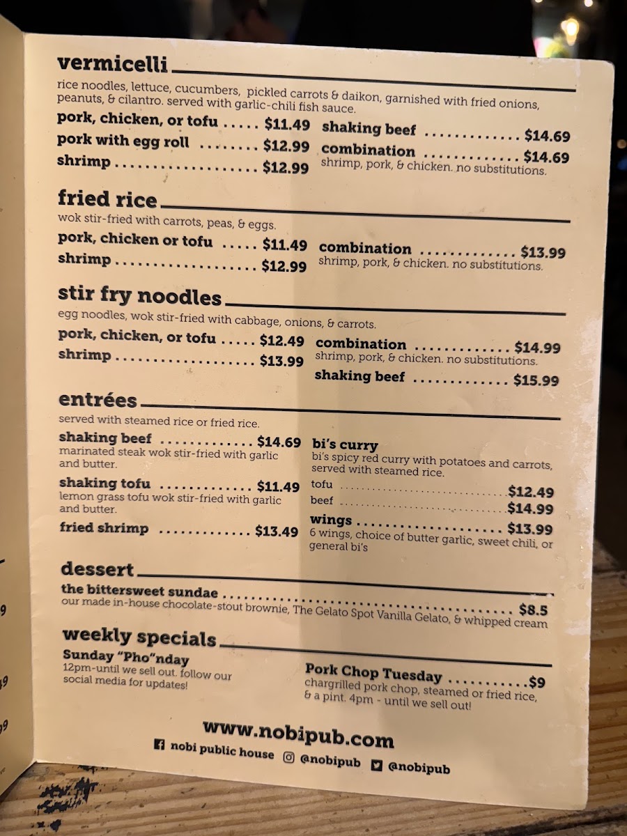 The menu at Nobi Public House features a variety of Asian fusion dishes alongside a selection of bar-style offerings. It is organized into several categories, including appetizers, stir fry noodles, and sauces, with an emphasis on combining Vietnamese-inspired flavors with classic pub fare.
